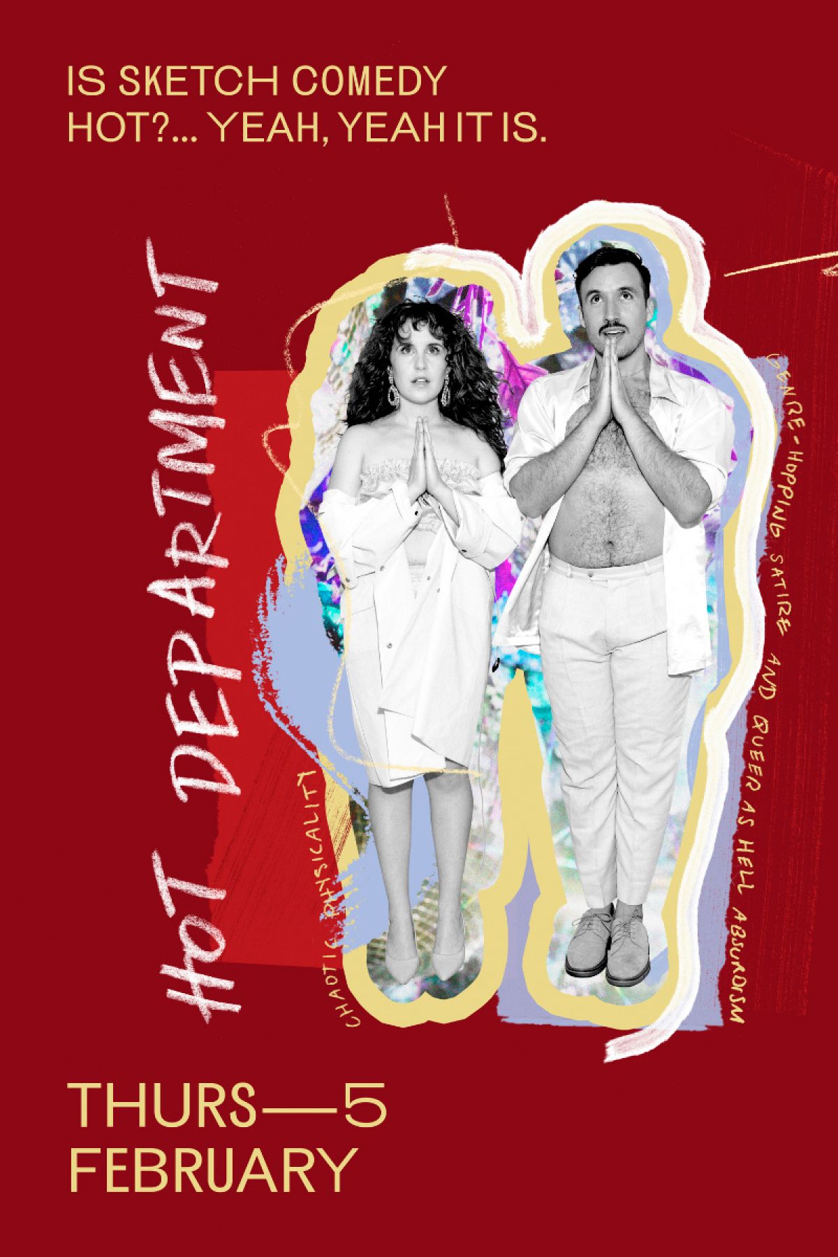 Hot Department have built a cult following in the Australian and international comedy scenes with their chaotic physicality, genre-hopping satire, and queer-as-hell absurdism—opening for the likes of Patti Harrison and Aunty Donna, and shaking up stages from Melbourne to London to New York to Ballarat. Hot Department are ready for world domination…but only if you promise you’re not mad at us.