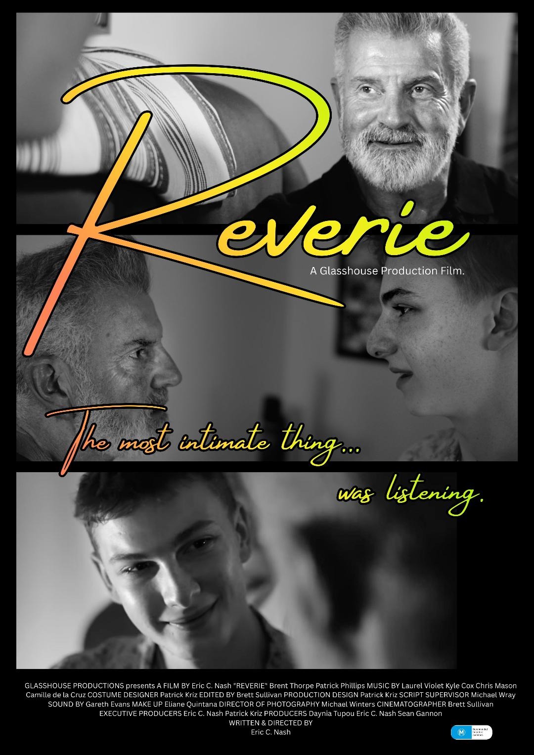 REVERIE is a drama about a newly divorced man in the 60s confronting the truth. He buried growing up in the 1970s Australia, when homosexuality was criminal. What begins as a one night stand becomes something far more intimate. The performances are vulnerable, fearless, and deeply moving.. starring Brent Thorpe and Patrick Phillips. Written and Directed by Eric C. Nash.